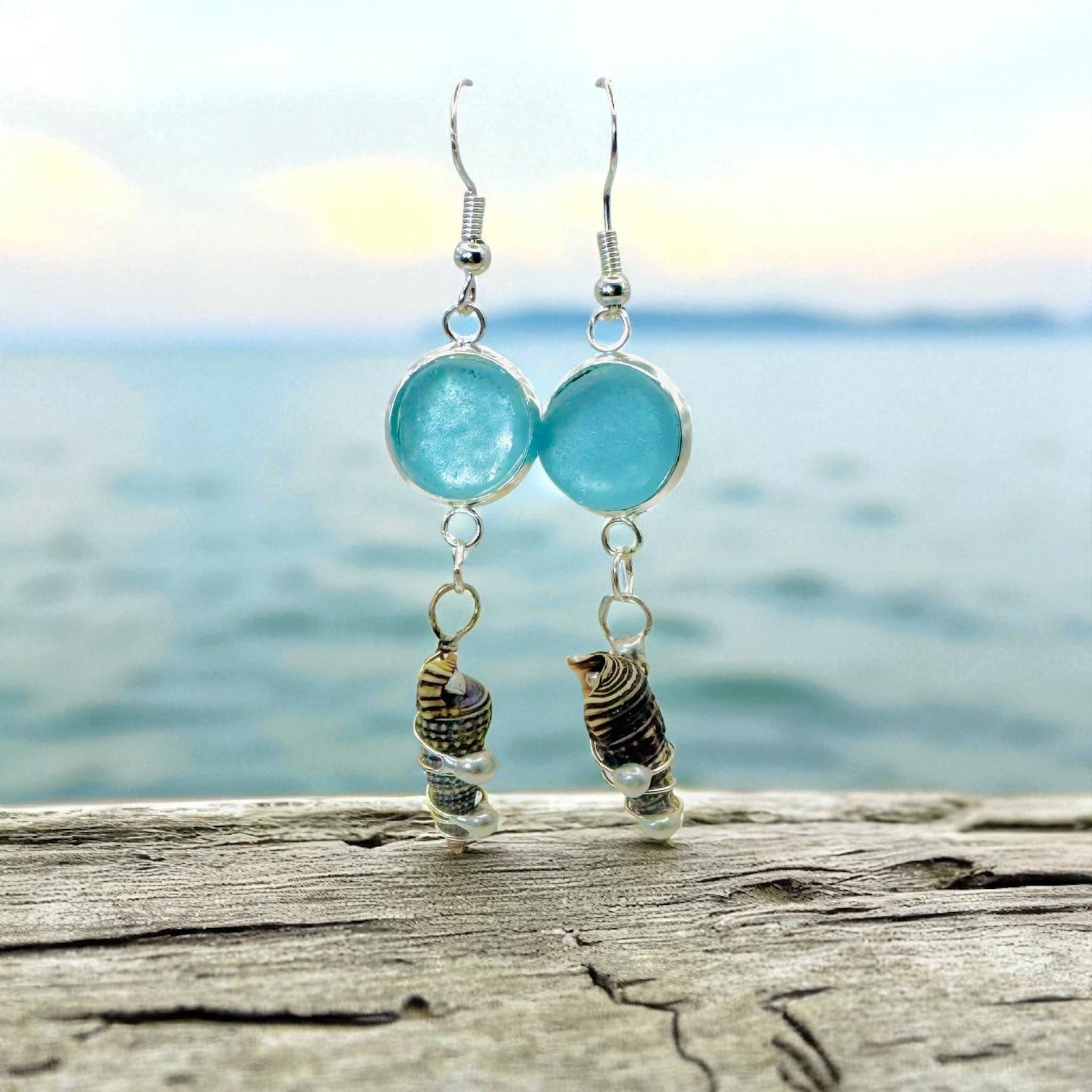 Delicate artisan earrings featuring a refreshing sea glass disc paired with natural shell accents. Each piece is handcrafted, ensuring a unique touch. These earrings effortlessly complement beach-inspired attire and offer a tranquil coastal vibe, making them a chic addition to any jewelry collection.
