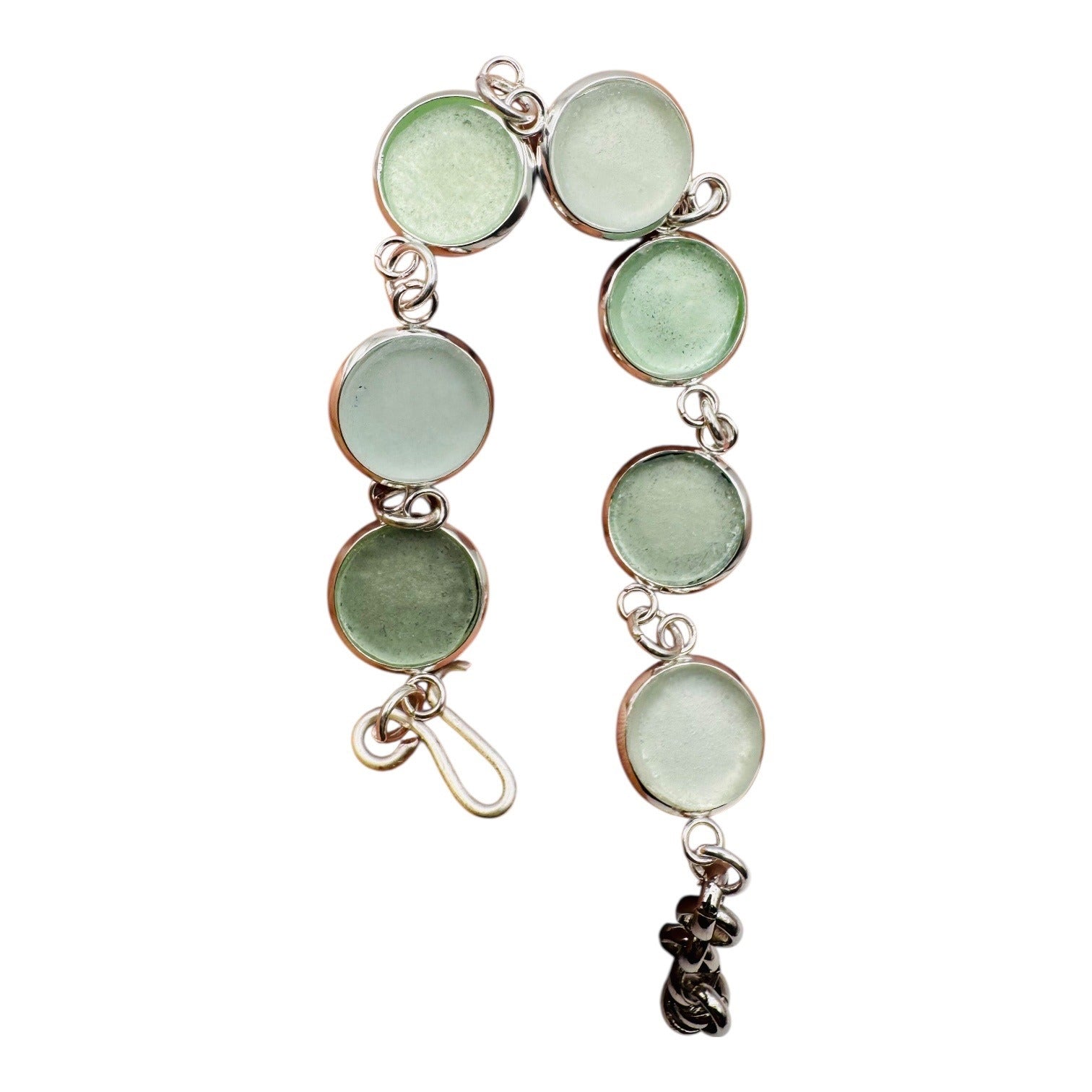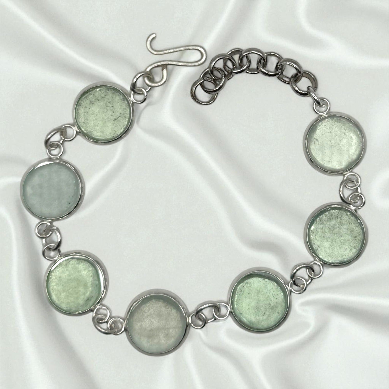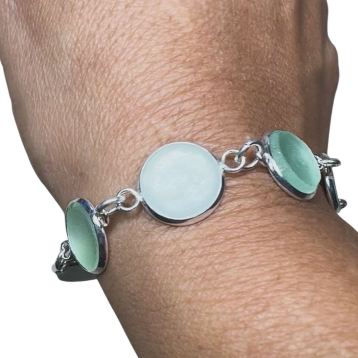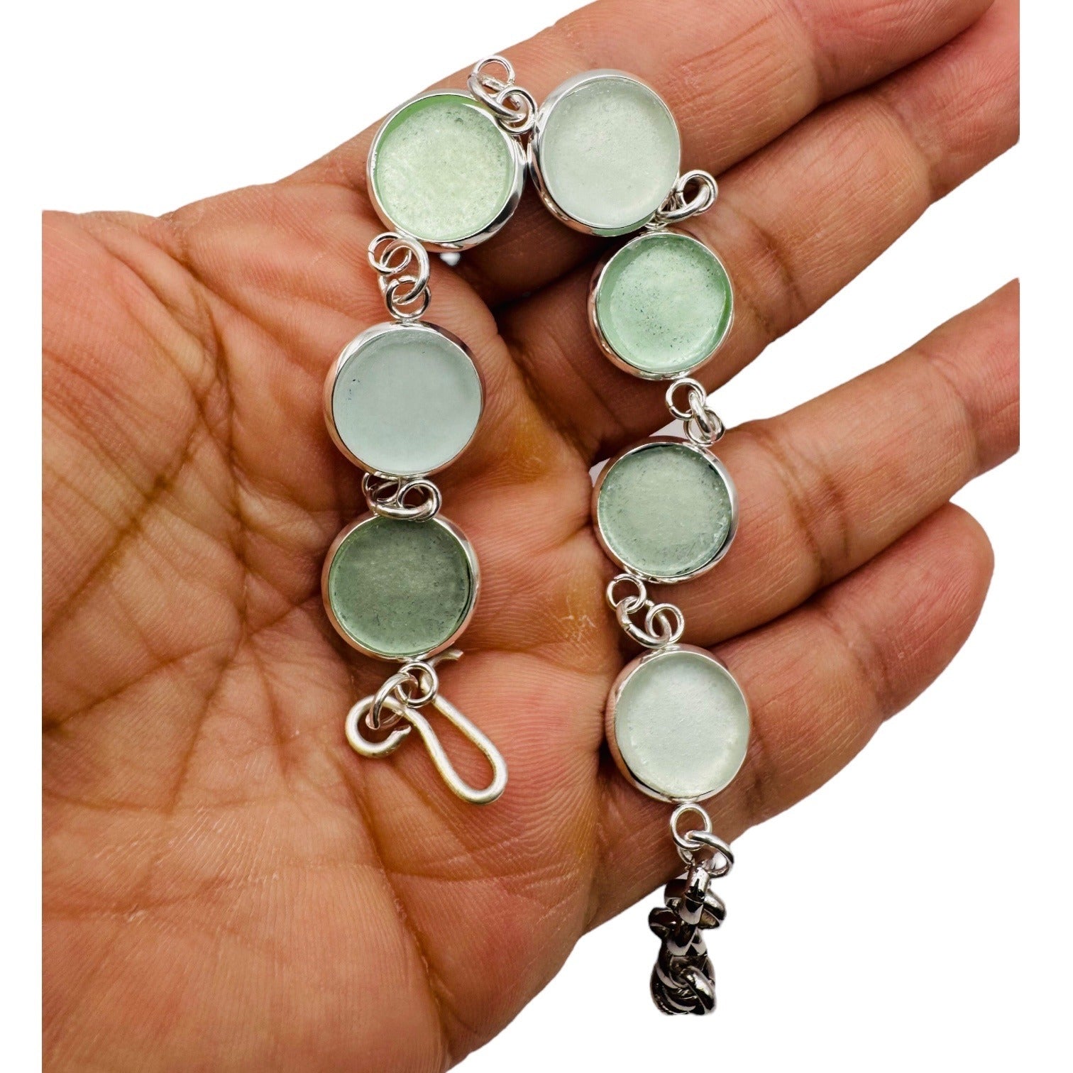 This artisan-crafted bracelet features genuine sea glass cabochons set in silver-plated frames. The unique design offers a touch of coastal elegance, making it a beautifully crafted piece for those who appreciate the artistry of handmade accessories. Its polished finish complements the soft colors, bringing a serene maritime charm to your wrist.