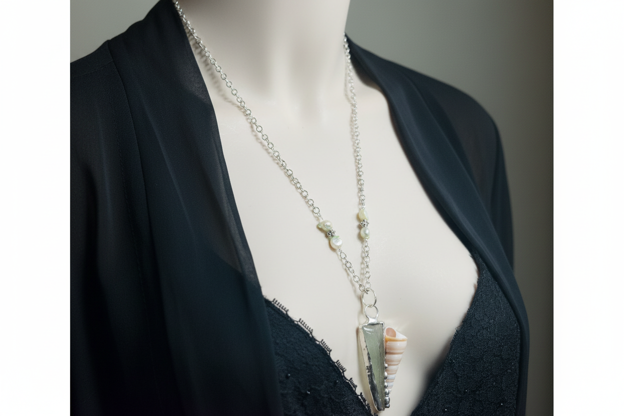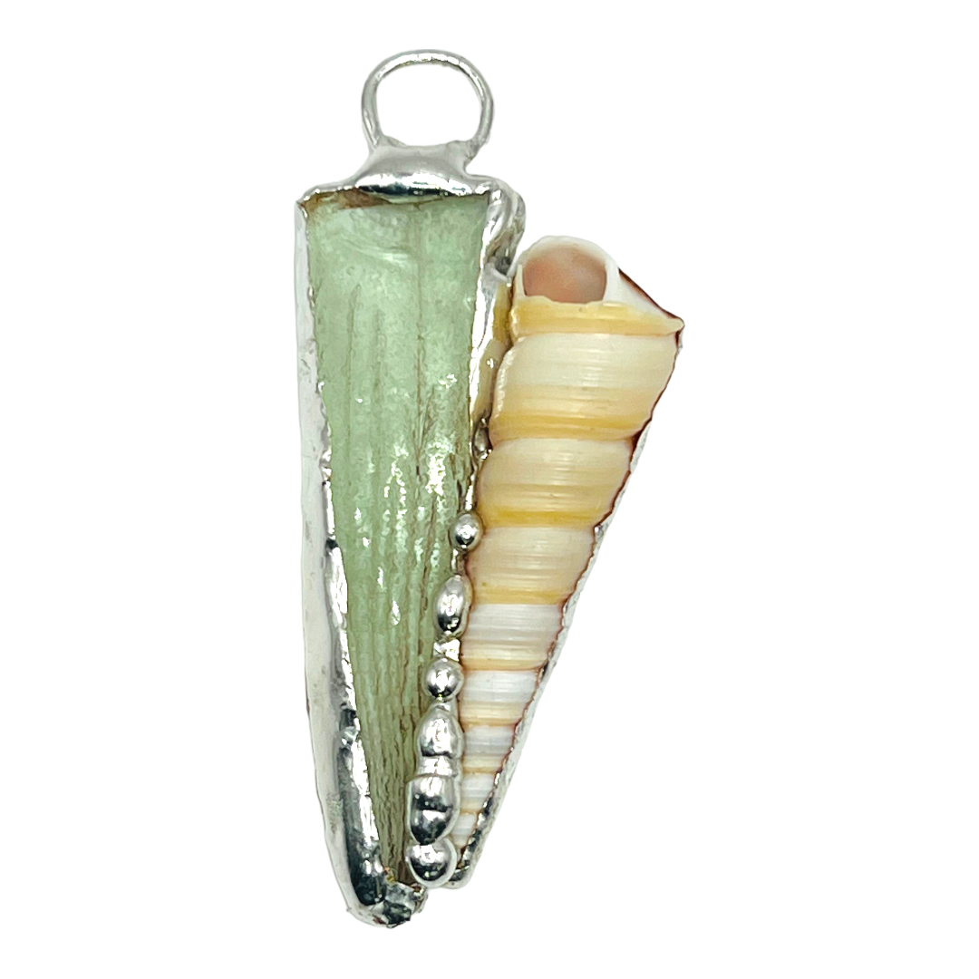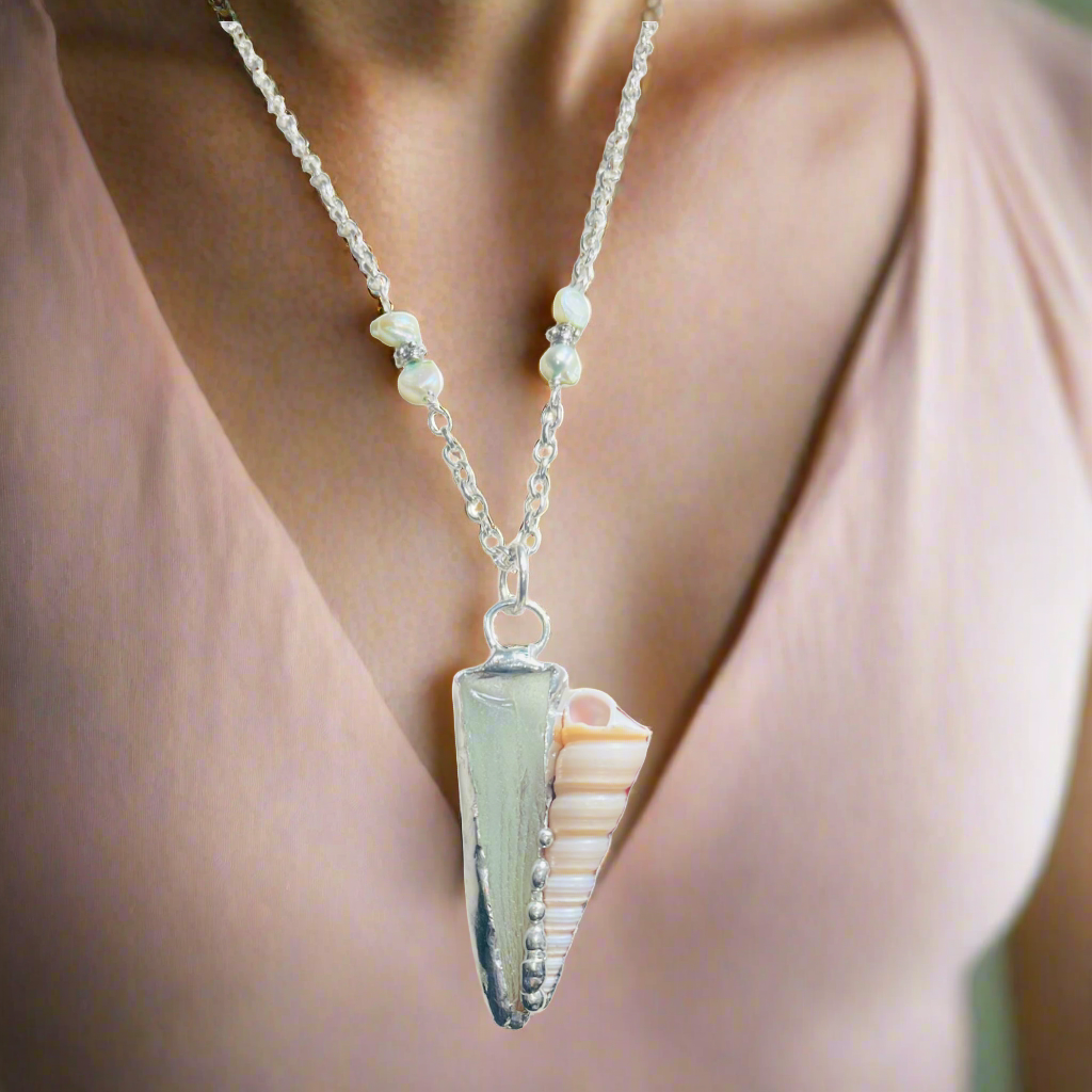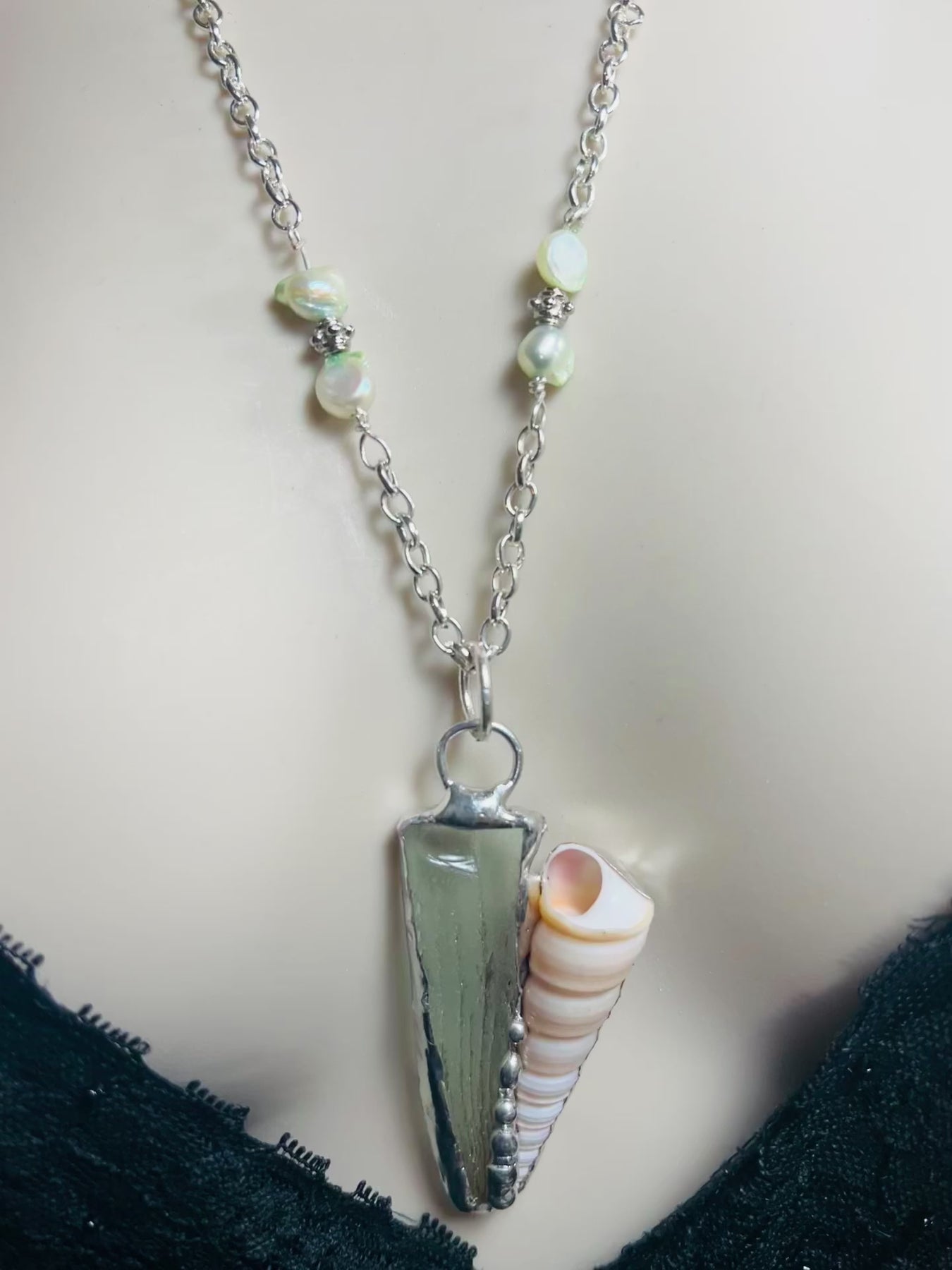 This beautiful nautical-themed necklace features green sea glass and a conch shell from a curated personal collection, combined with real freshwater pearls that are wire-wrapped by hand. The silver-plated material is lead and nickel-free, making it safe and comfortable to wear.
