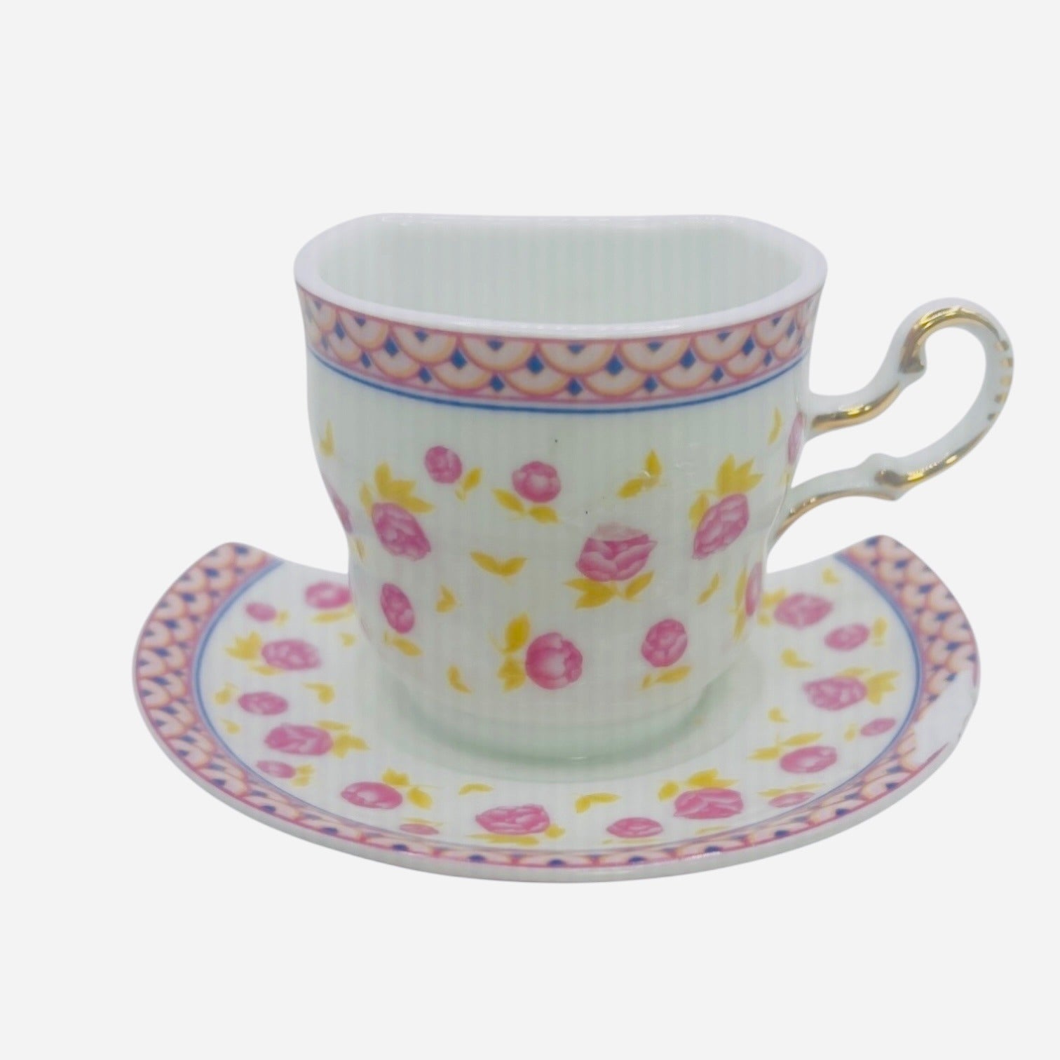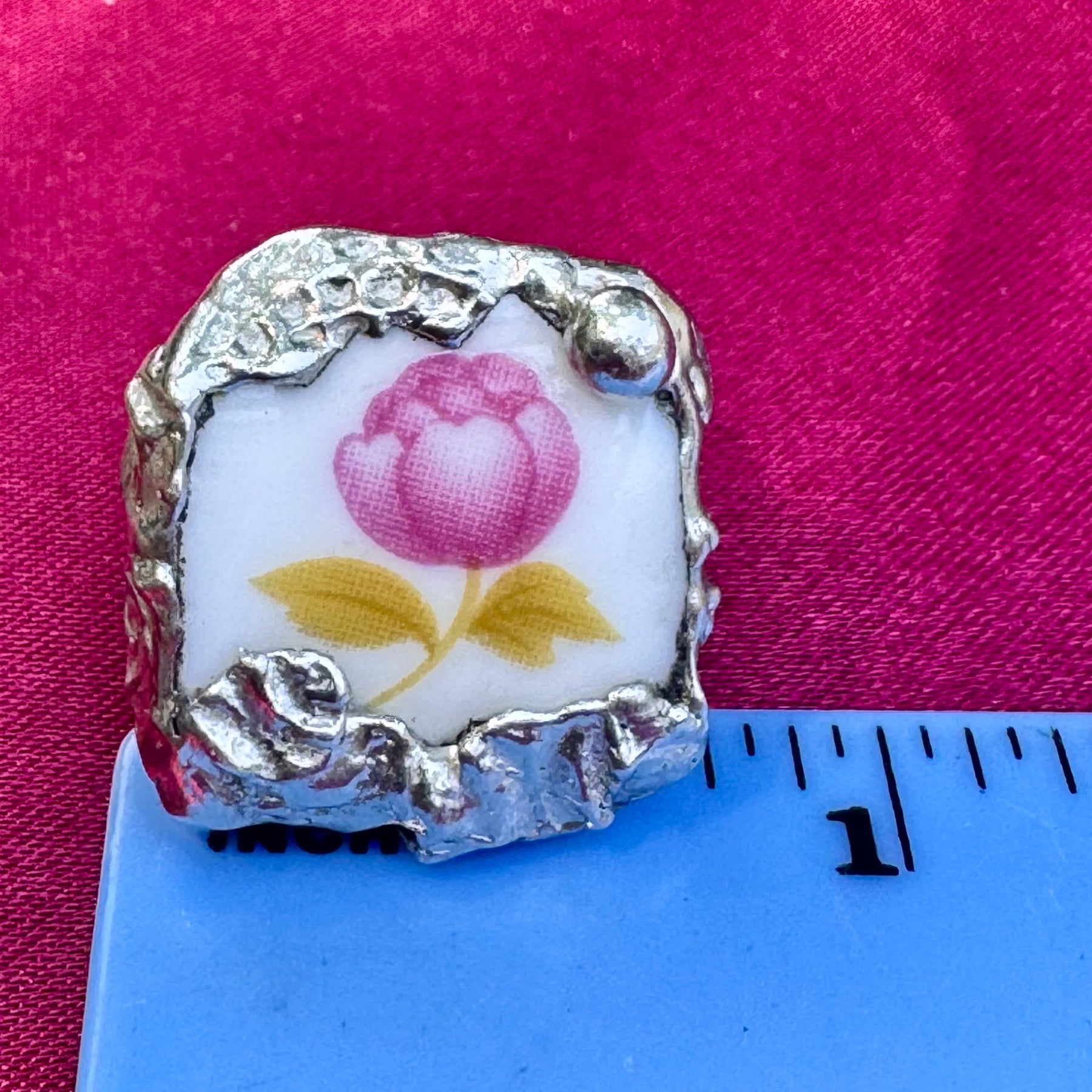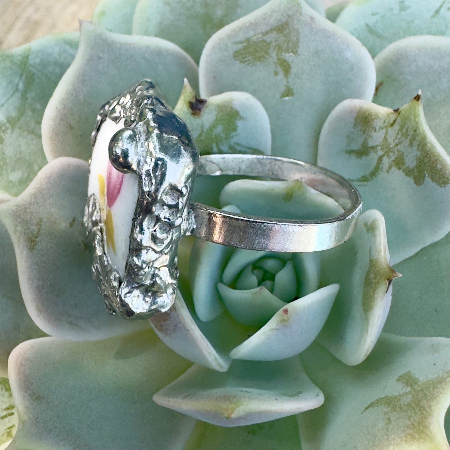 Once upon a time, a delicate piece of china was cherished in a bustling tea room. Now, reborn as a unique ring, it carries stories of laughter and friendship. Framed in silversmith's metalwork, the porcelain flower motif blooms eternally, offering a glimpse into its elegant past.