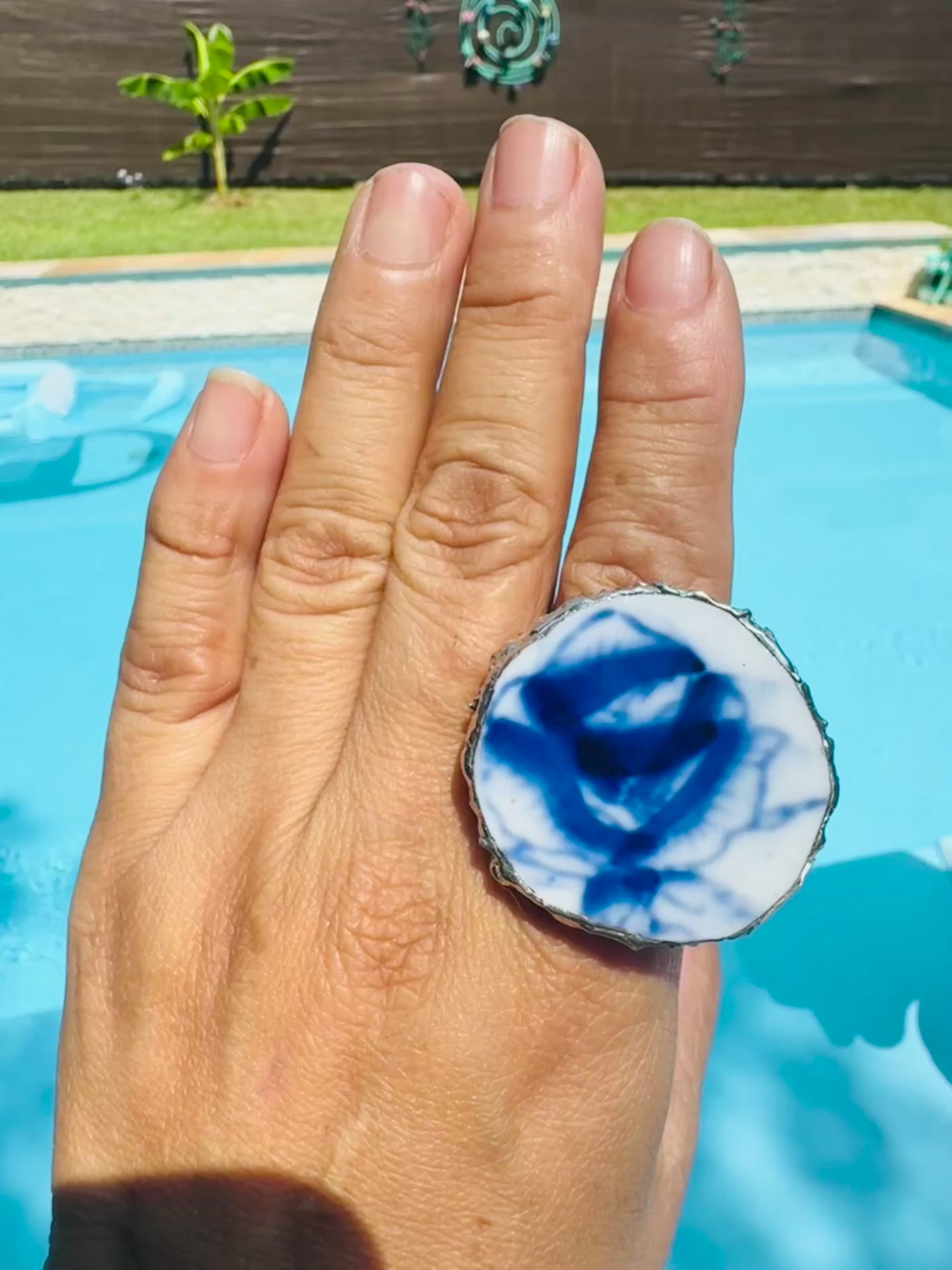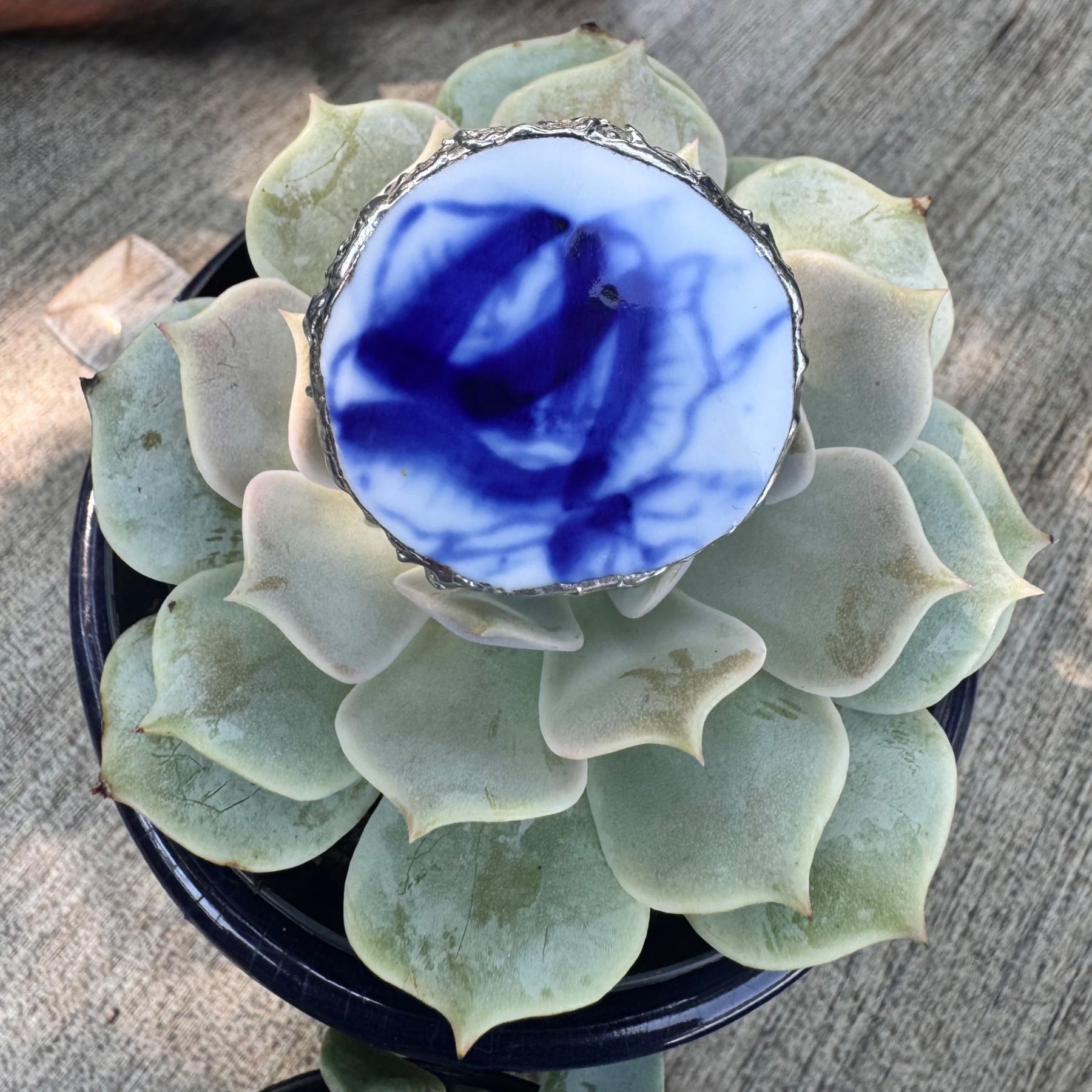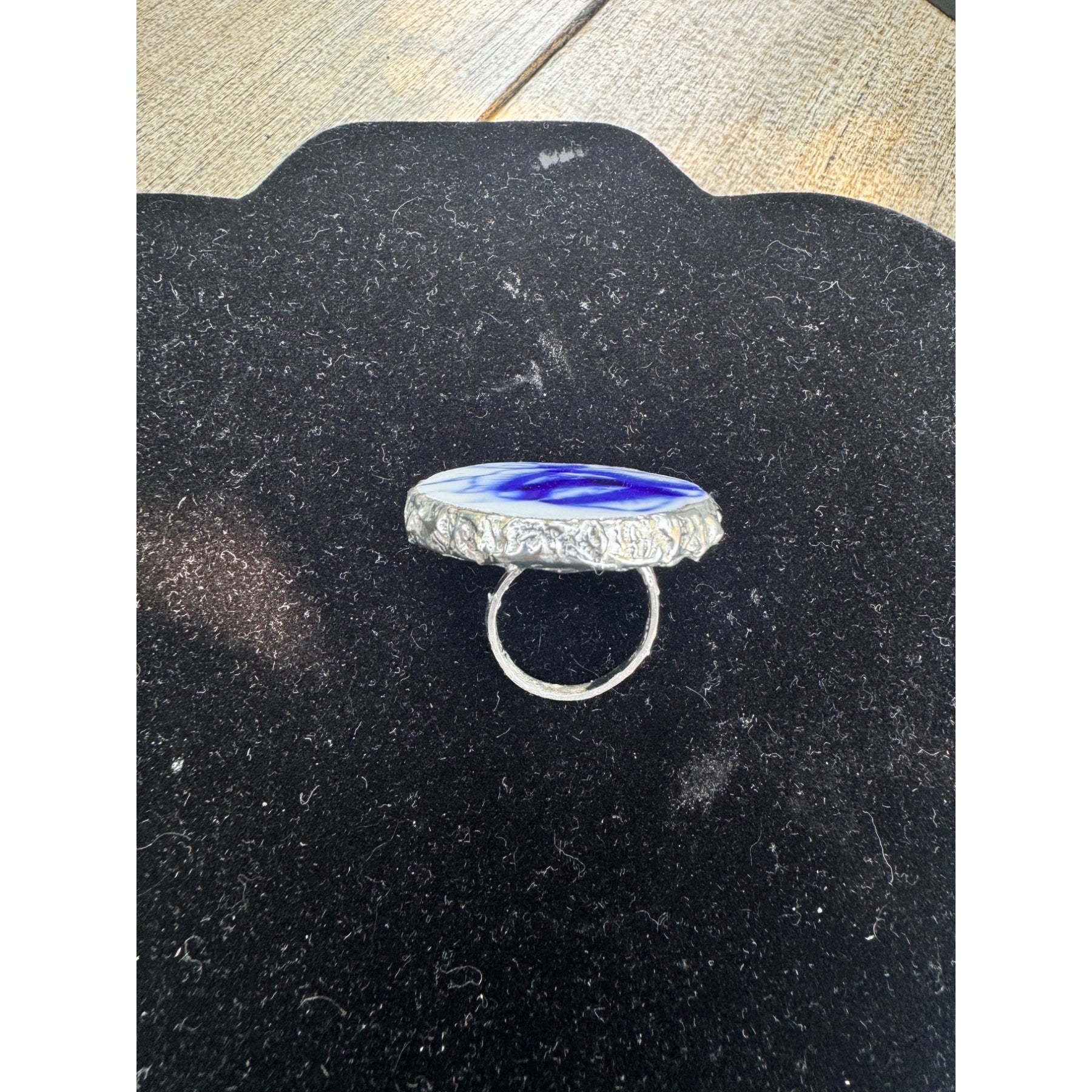 Once upon a time, a piece of broken china lay forgotten, until a skilled artisan breathed life into it, transforming it into a stunning silver ring. Its vivid blue hues tell tales of elegance, while the intricate metalwork whispers secrets of a bygone era. Adorn your hand with a piece of history.
