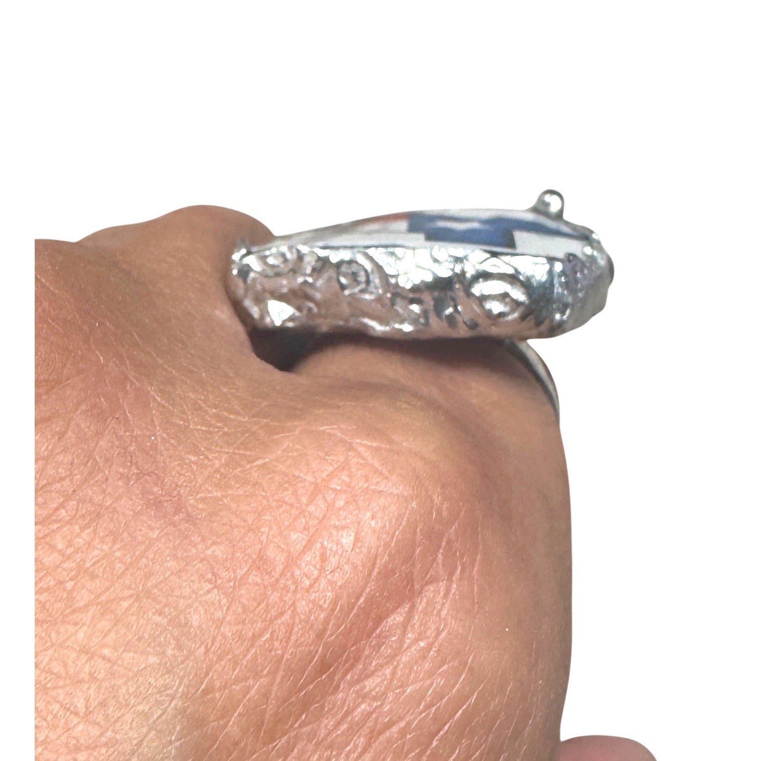 This handcrafted ring transforms broken china into a bold statement piece. Featuring the Texas flag, its silver alloy metalwork exudes rustic charm and individuality.