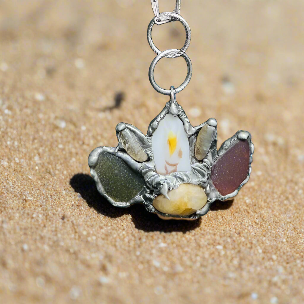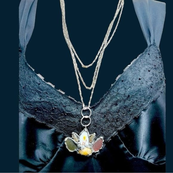 I created this one-of-a-kind Pendant by using a boho Metalwork solder technique and Sterling Silver wire to fuse all of these gorgeous stones and fragments of a vintage fine bone china plate together. I used a black patina for a vintage effect and hand polished and sealed it to retain its sheen. The necklace is a vintage 3 tiered chain necklace piece from the 90s.