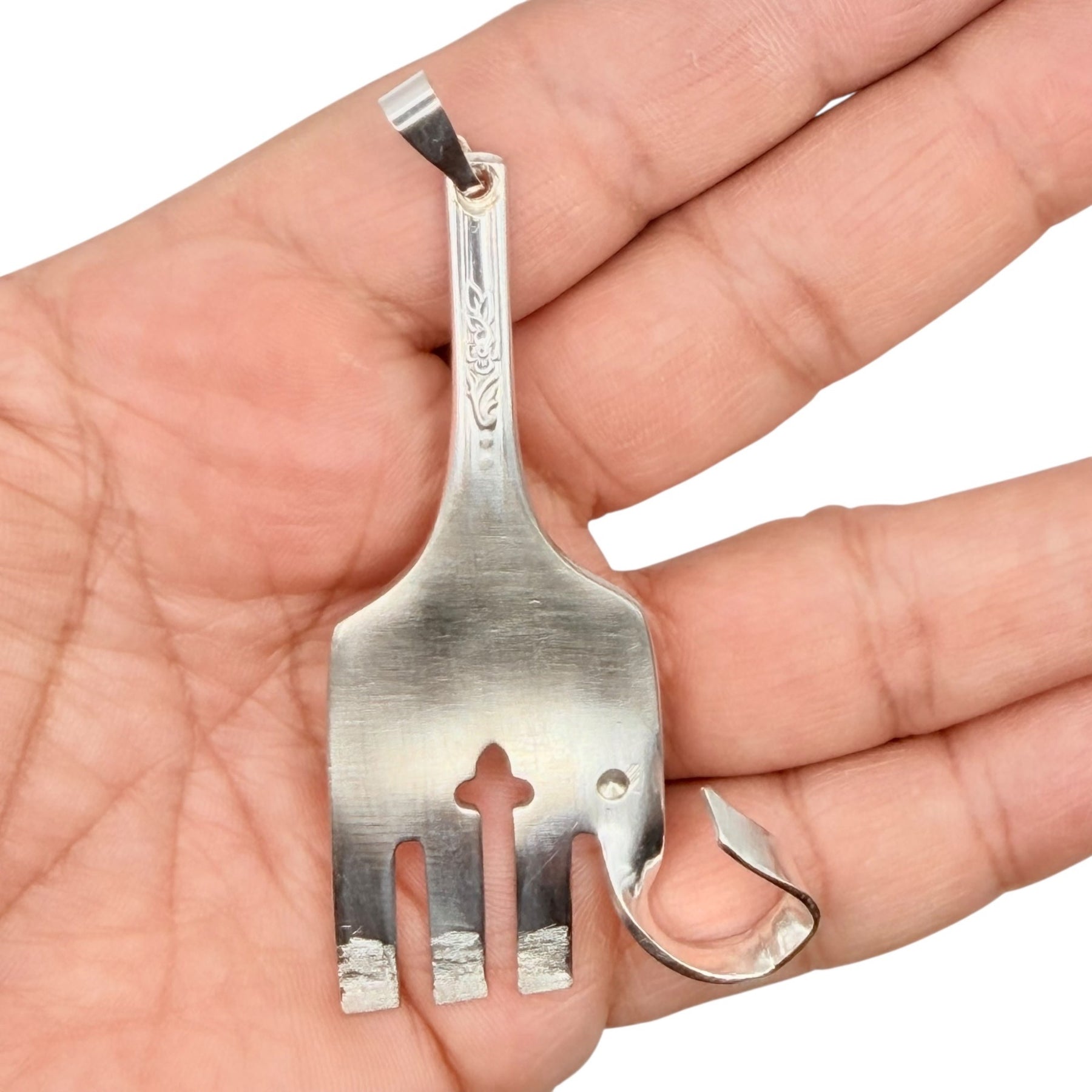 Transform your style with a piece of wearable history. This extraordinary elephant pendant is handcrafted from an authentic Tudor silver fork, artfully shaped into an elegant elephant silhouette adorned with intricate floral engravings. Each curve and detail tells a story of vintage craftsmanship reimagined for the modern jewelry lover who values sustainability and one-of-a-kind artistry.