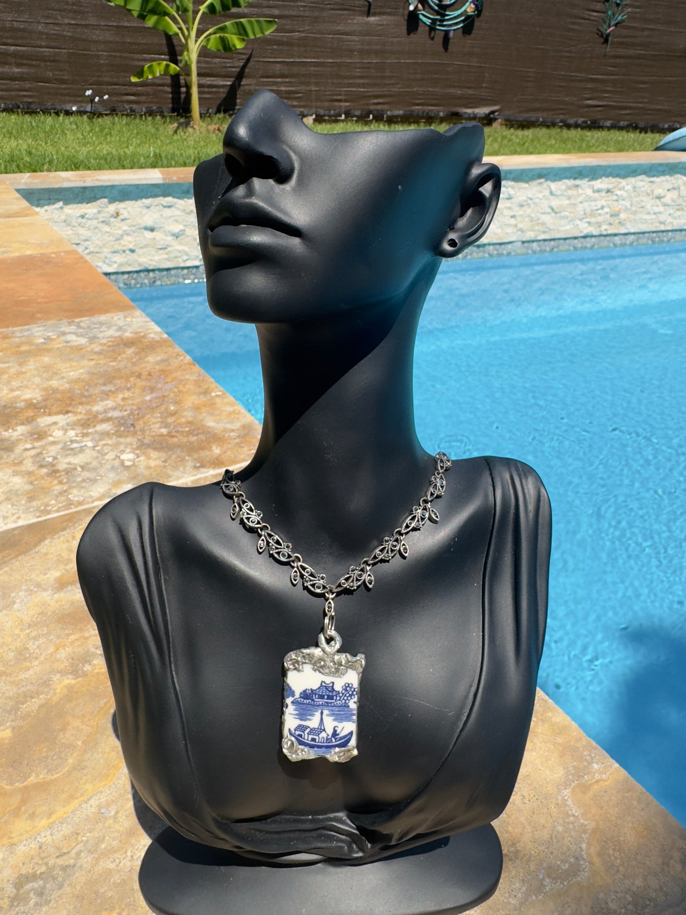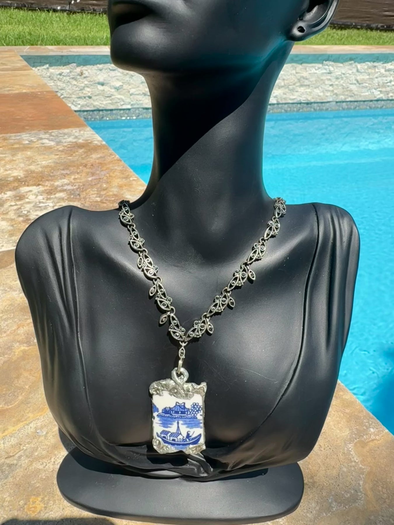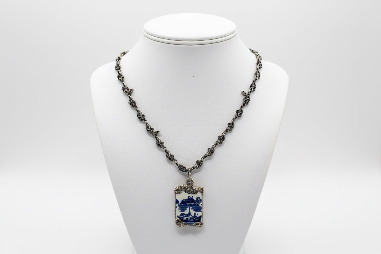 Embrace a bold look with our English Fine Bone Broken Blue Willow China Pendant, beautifully set in detailed Boho-style metalwork and complemented by a vintage Marcasite necklace. Featuring a captivating Asian-inspired design, this piece invites you to express your adventurous spirit. Crafted using a soldering technique that ensures lasting shine, the alloy—96% tin and 4% silver—is lead-free and safe. Over time, its luster can be gently restored with steel wool, keeping this unique accessory radiant for years to come.