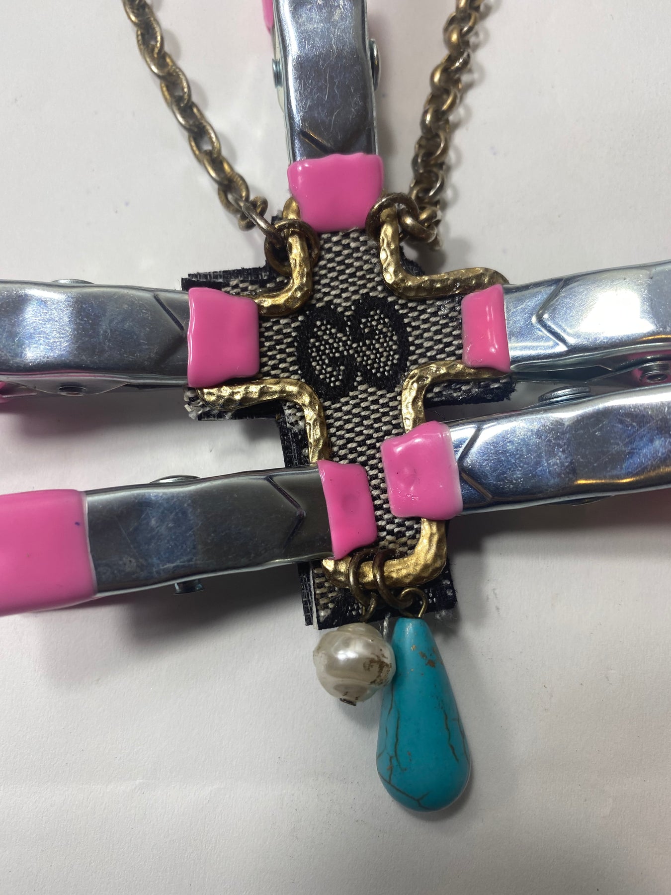 This necklace embodies the art of upcycling at its finest. By rescuing damaged luxury canvas bags and vintage jewelry fragments, we create something entirely new while honoring the craftsmanship of the original pieces. The iconic logo canvas combined with vintage jewelry creates a fusion of heritage luxury and modern sustainability.