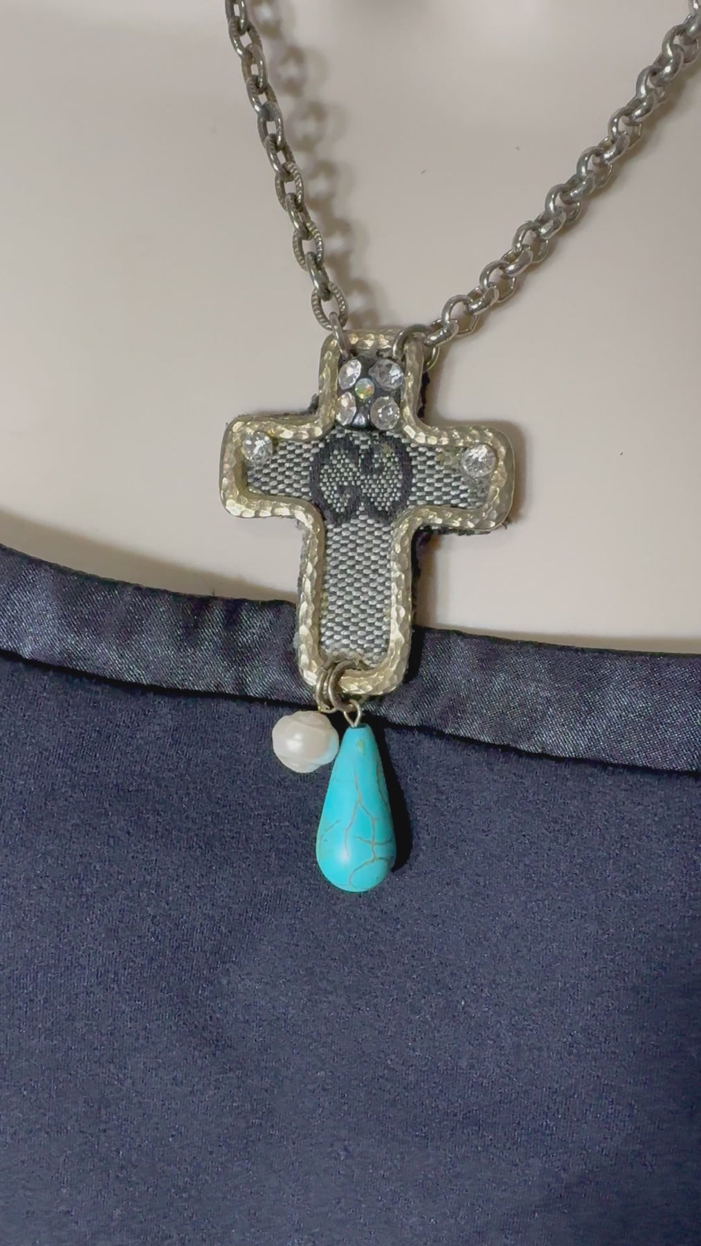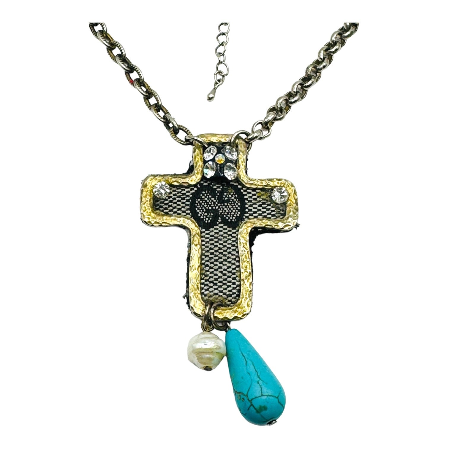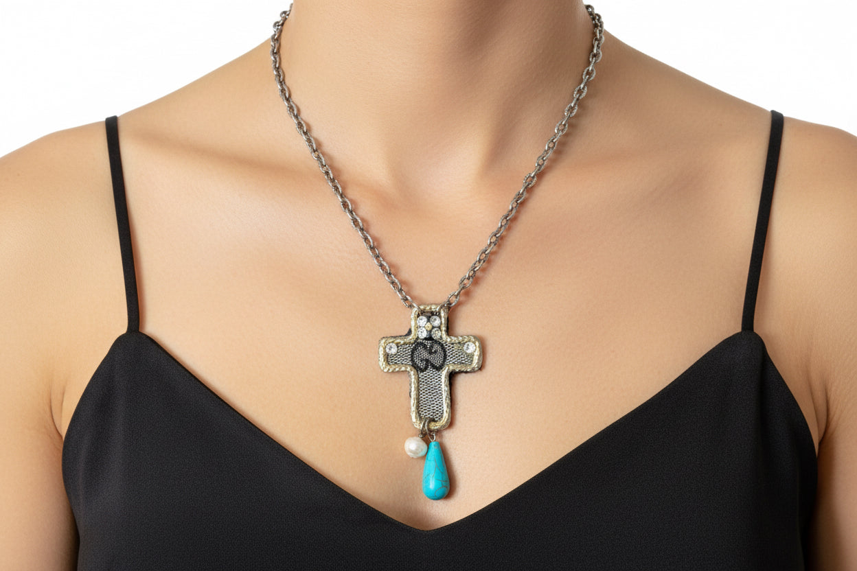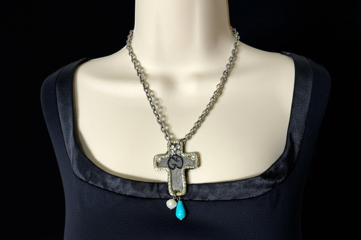 A stunning celebration of sustainable luxury and artisan craftsmanship. This one-of-a-kind cross pendant is meticulously reworked from authentic luxury bag canvas, adorned with rescued fragments of vintage jewelry and natural gemstones. Each element tells a story of transformation, creating a unique statement piece that honors both heritage and sustainability.