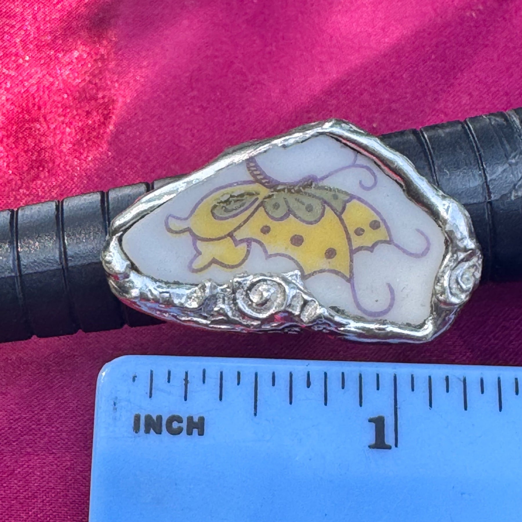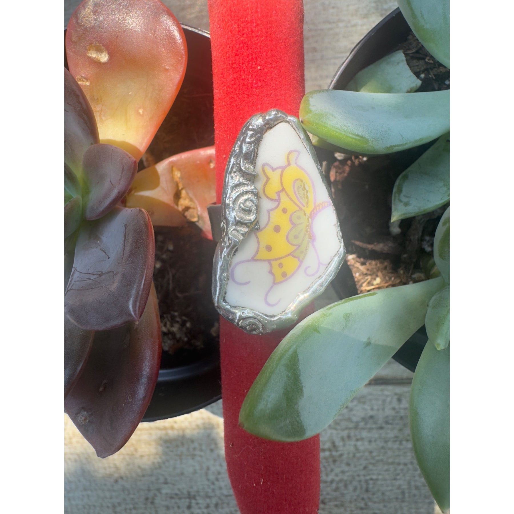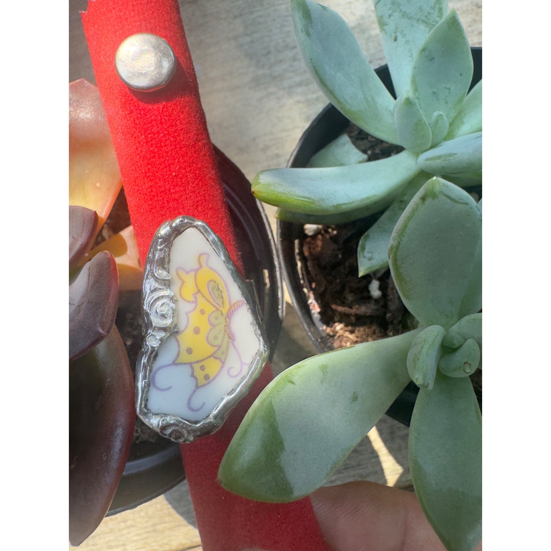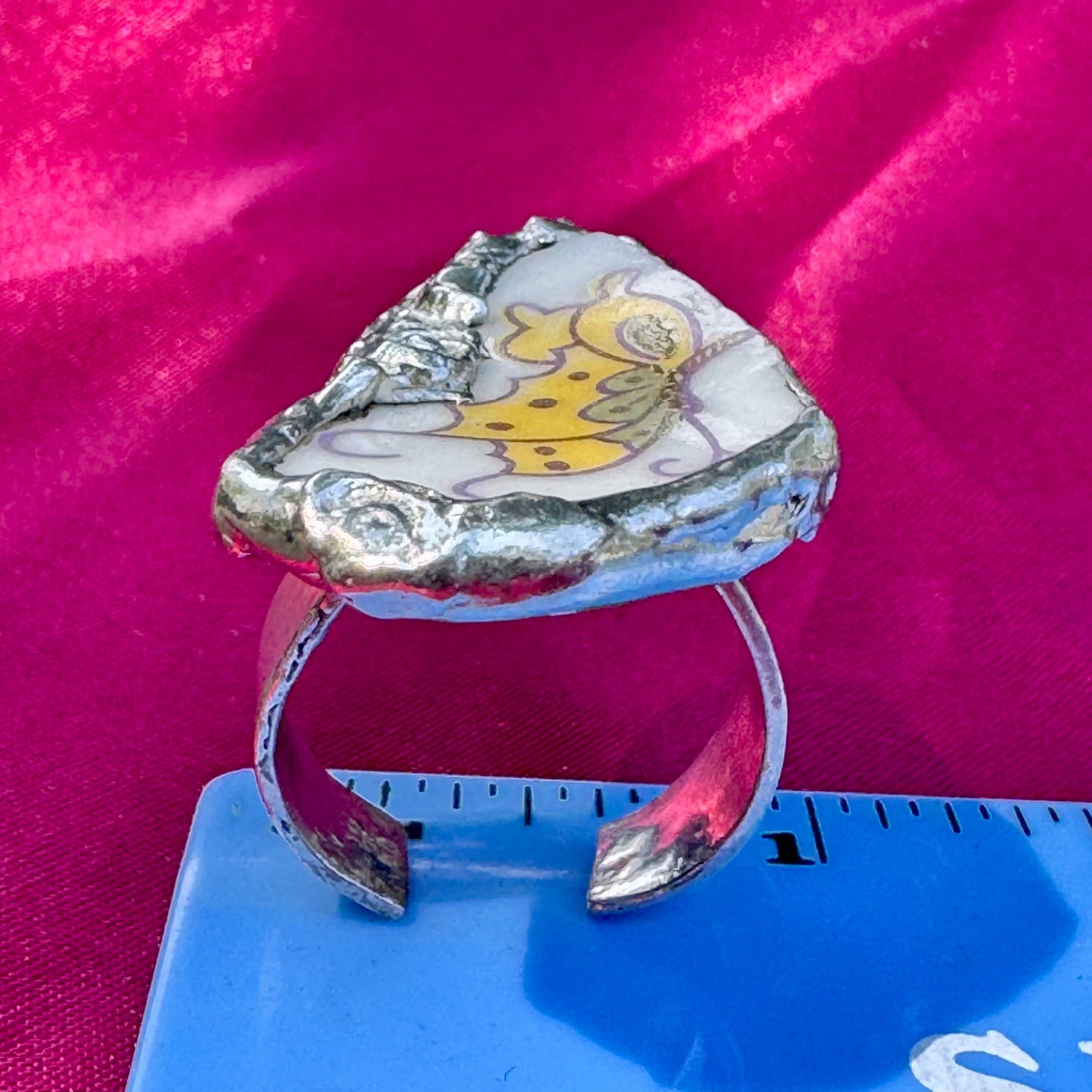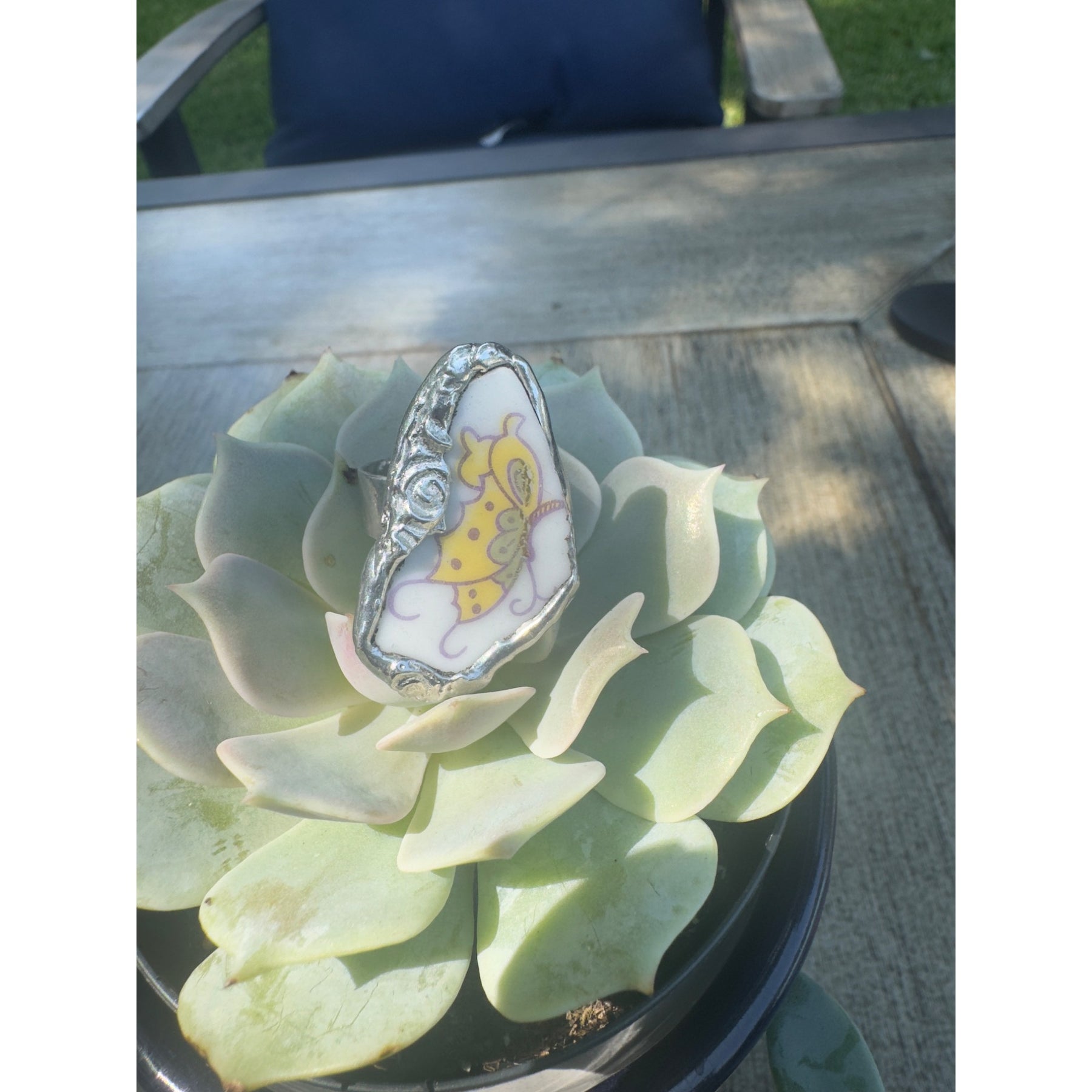 Beneath the whispers of time, this unique ring tells a tale of transformation. Crafted from a broken piece of china, it features a whimsical umbrella design, framed by a vintage spoon bowl band. This piece is more than jewelry—it's a story of rebirth, a nod to the beauty found in second chances.