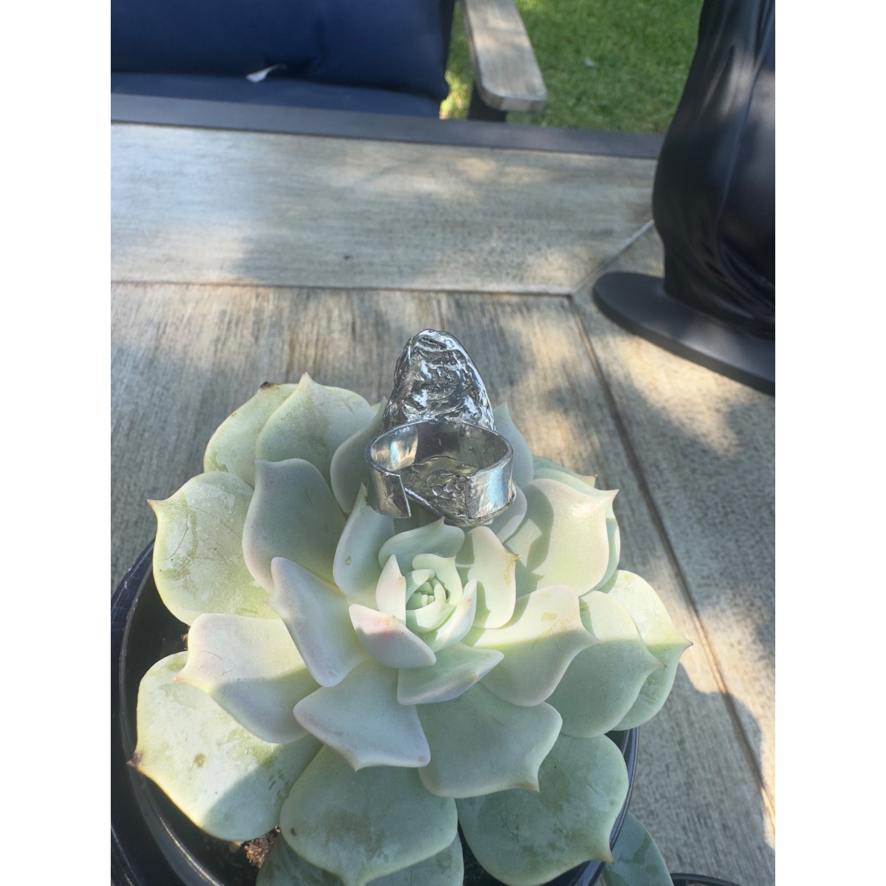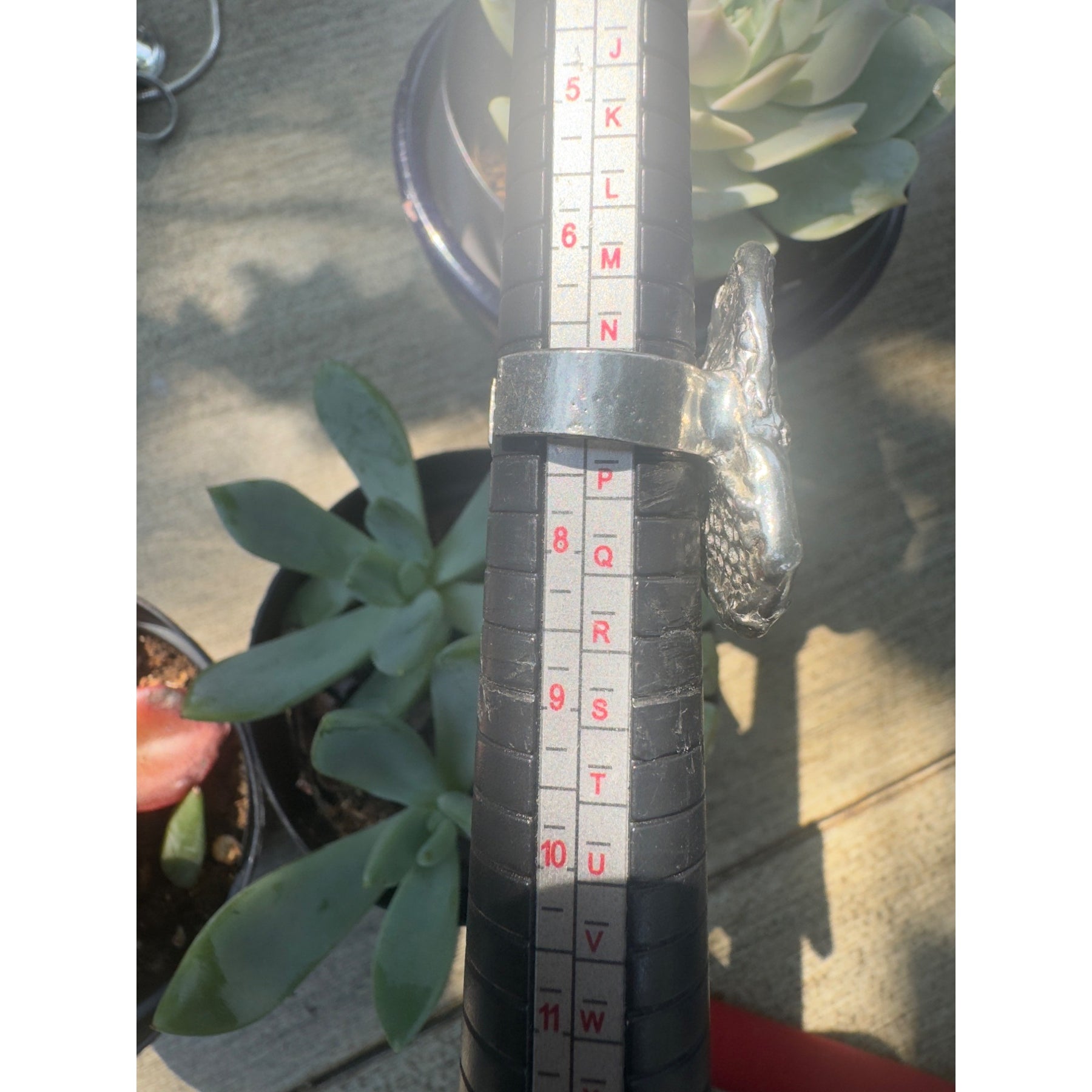 Ring band shows textures, adding to its hand crafted charm. Top to bottom = 1 inch.