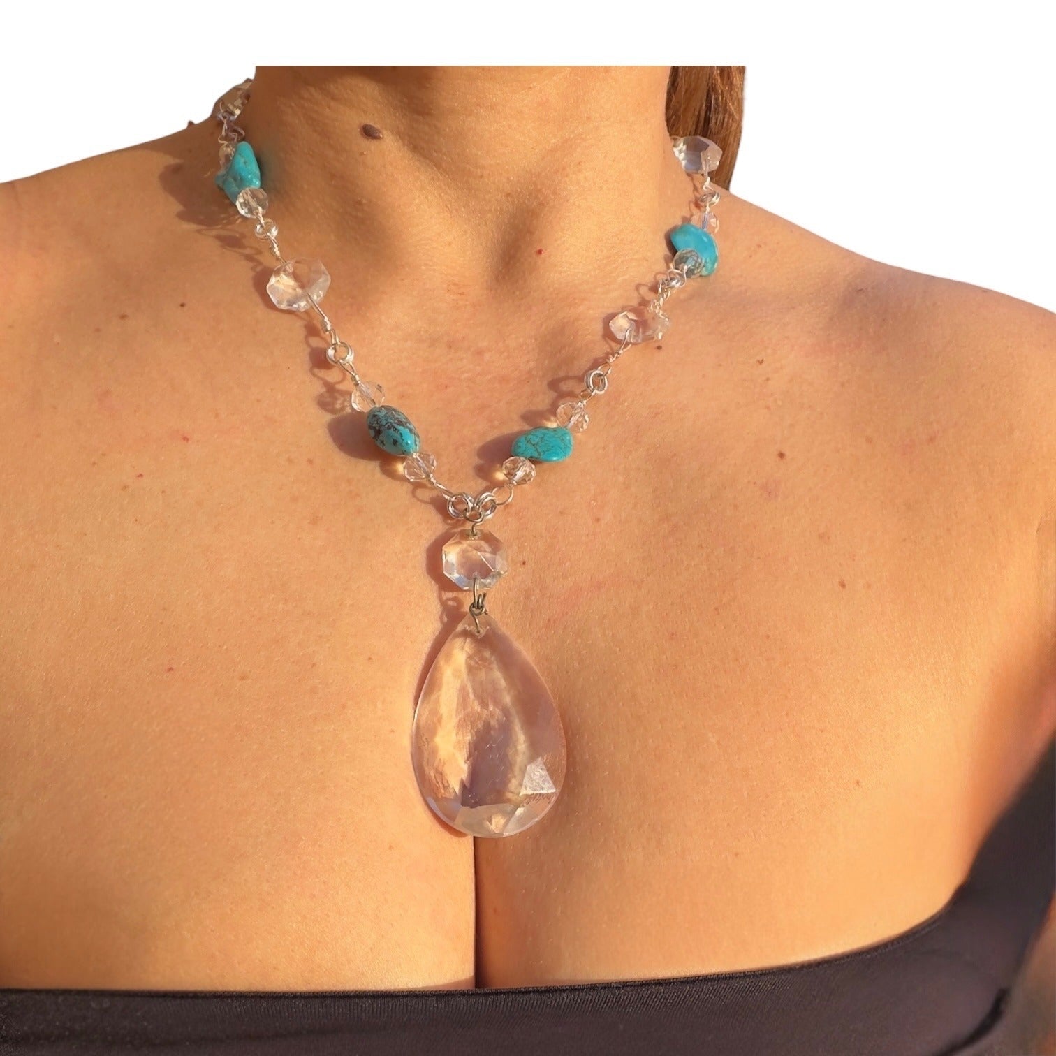 This isn't just a necklace—it's rescued history reimagined. Each chandelier crystal once graced an elegant lighting fixture, catching and reflecting light in grand spaces. Now given new life alongside genuine turquoise stones, this piece celebrates the beauty of upcycling and the artistry of transformation. Every crystal and stone is individually hand-wrapped, creating a one-of-a-kind treasure.