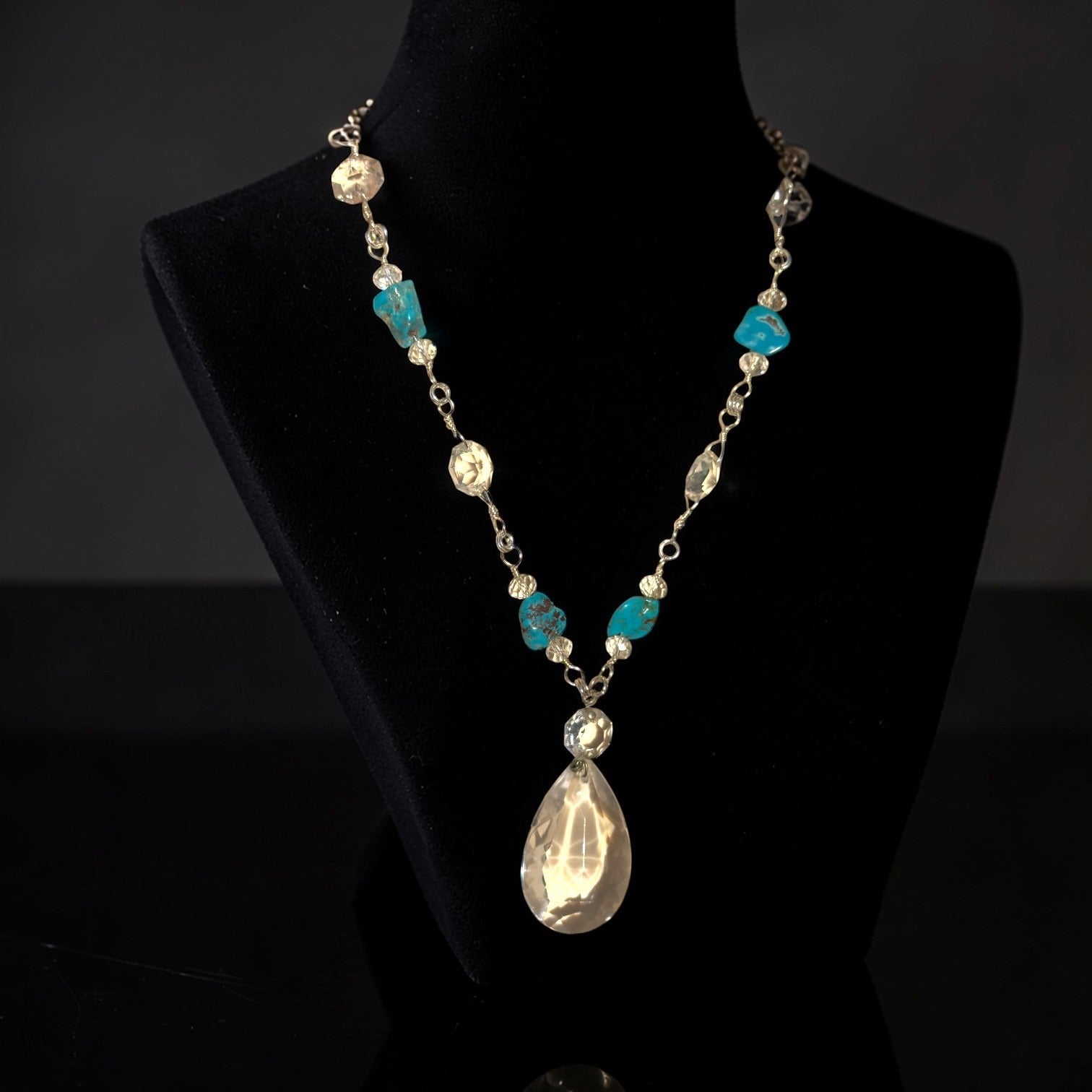 Illuminate your style with rescued elegance. This stunning necklace features sparkling vintage chandelier crystals paired with genuine turquoise stones, each carefully hand-wrapped in silver-plated wire. A breathtaking fusion of vintage glamour and natural beauty that transforms rescued treasures into wearable art.