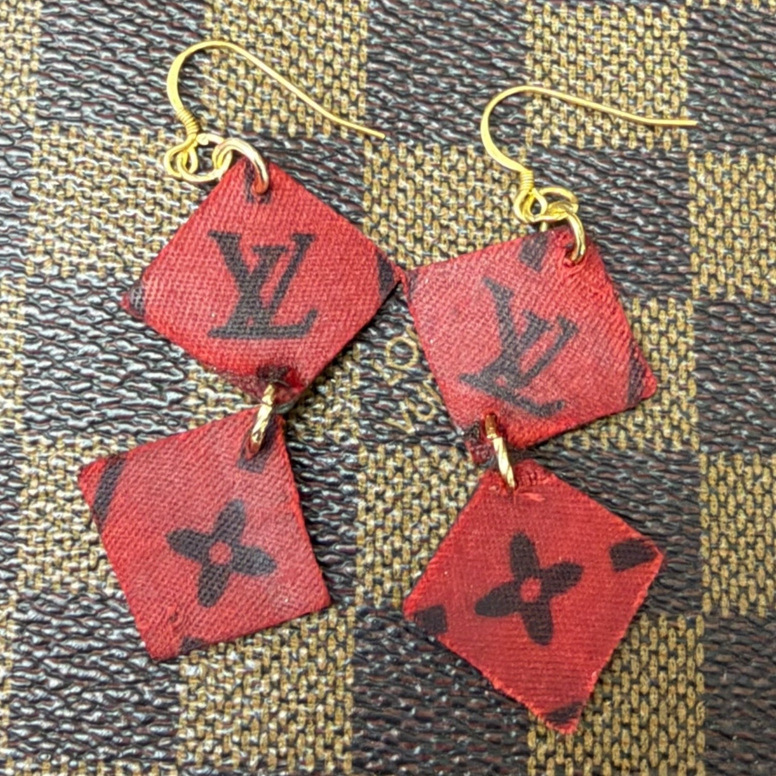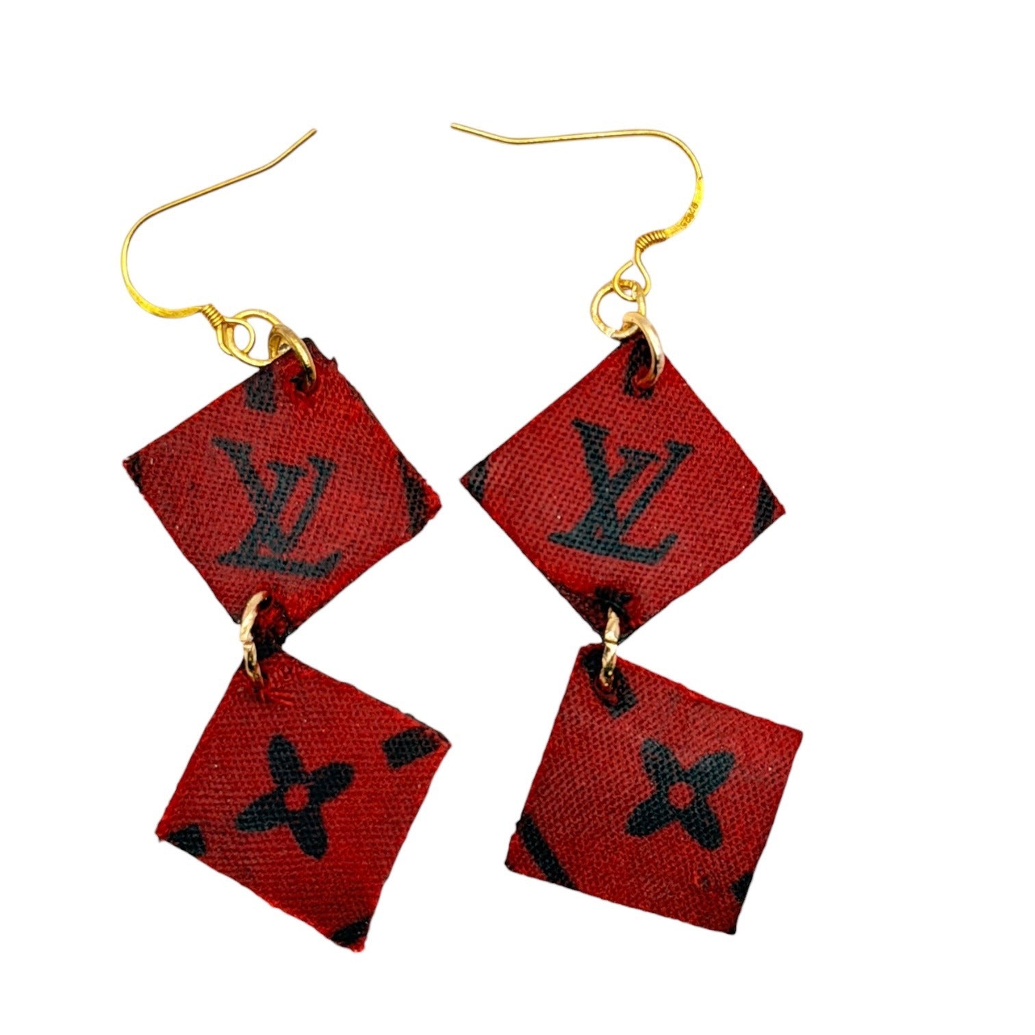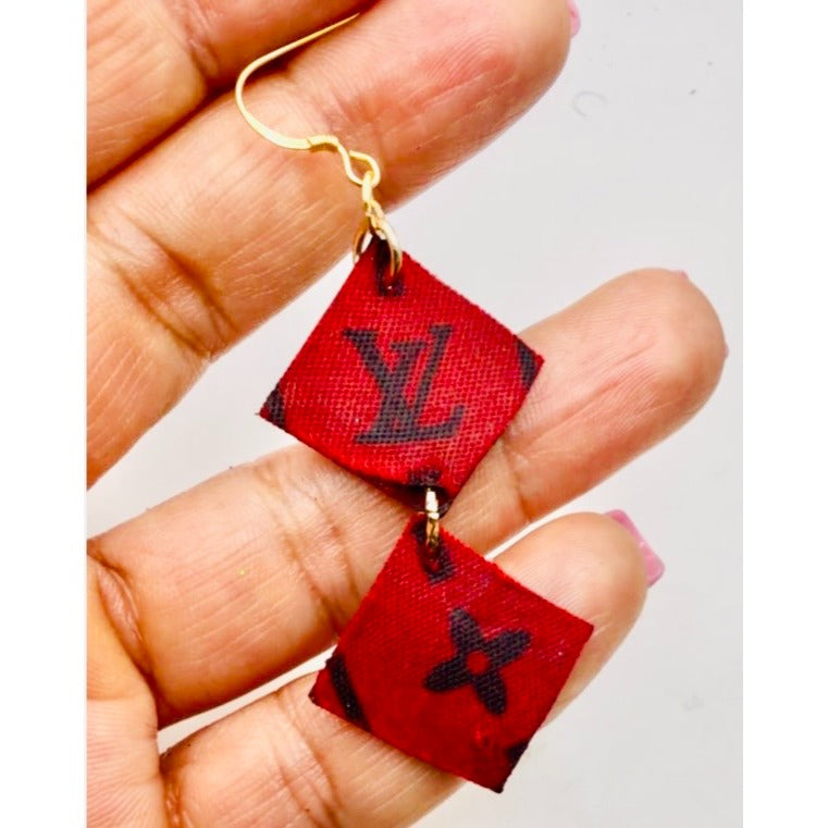 Luxury reimagined. These stunning dangle earrings are handcrafted from authentic French designer signature canvas, rescued and transformed into wearable art. Featuring elegant gold-tone 925 sterling silver hooks, these lightweight statement pieces blend sustainable luxury with timeless style.