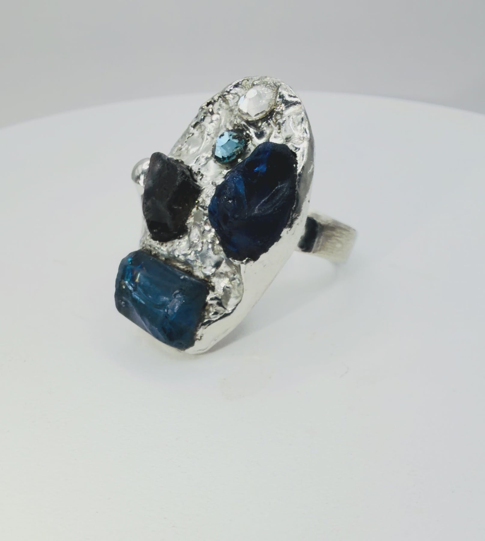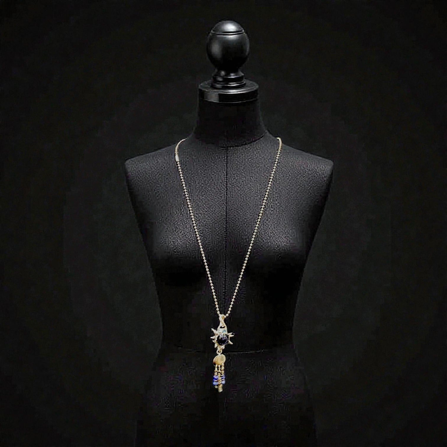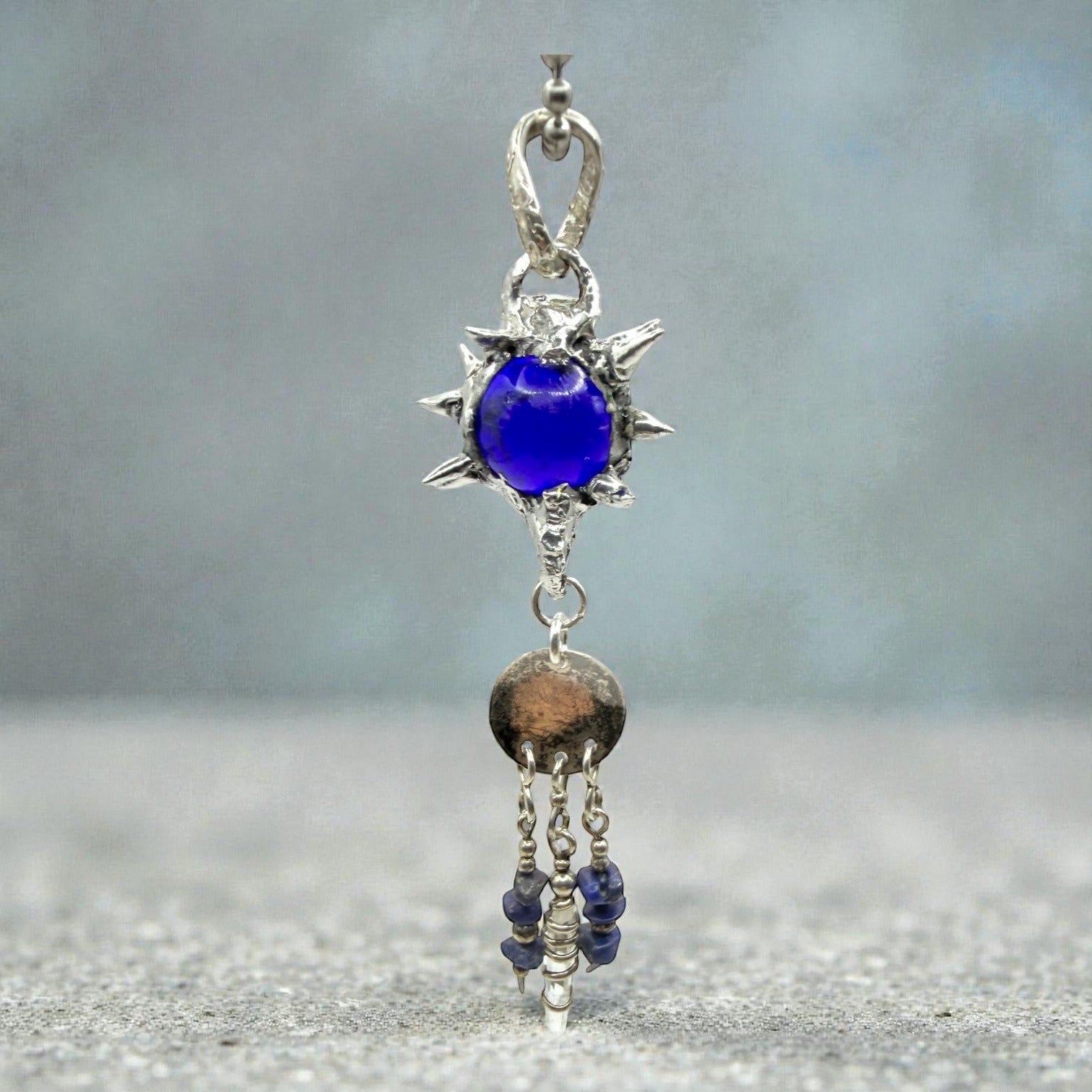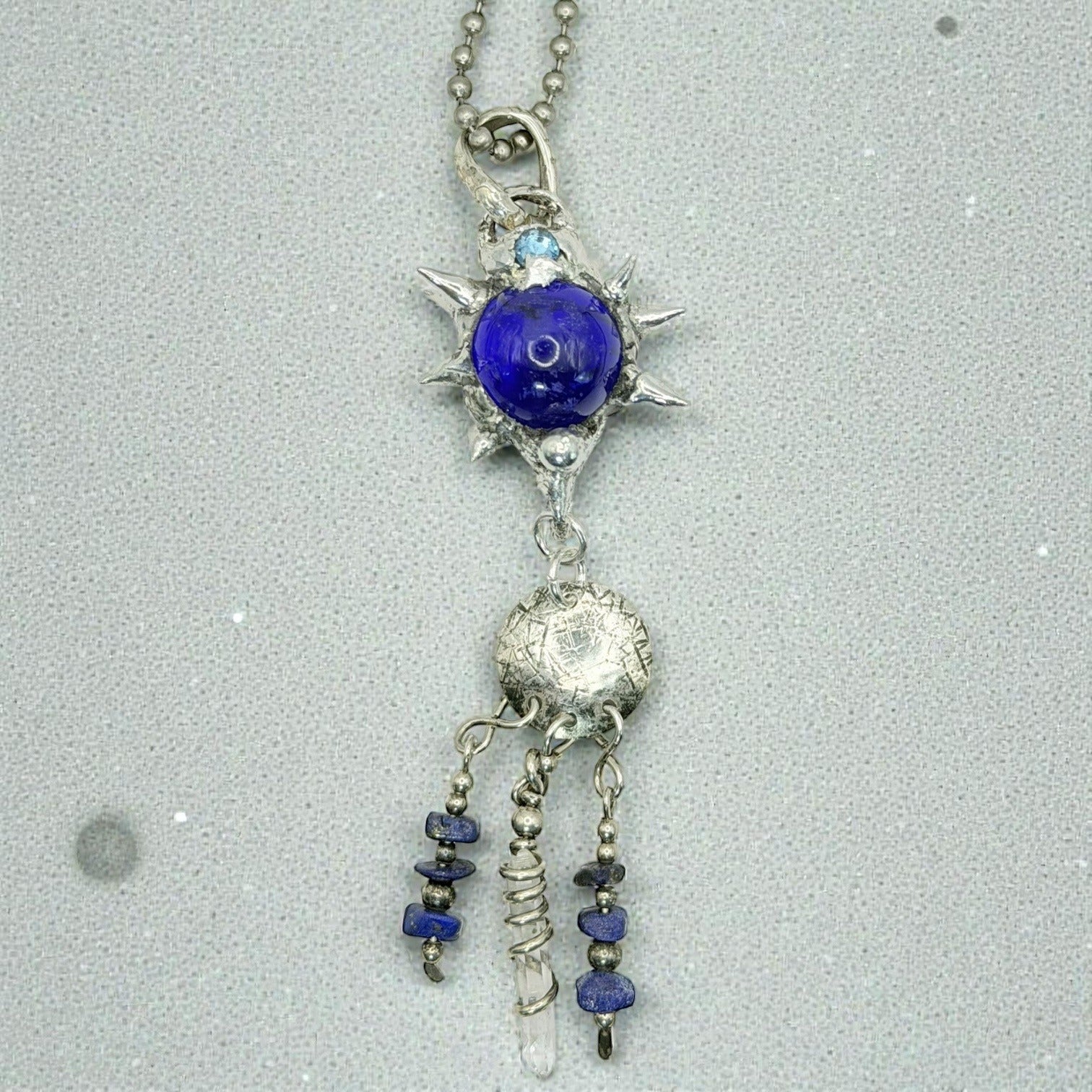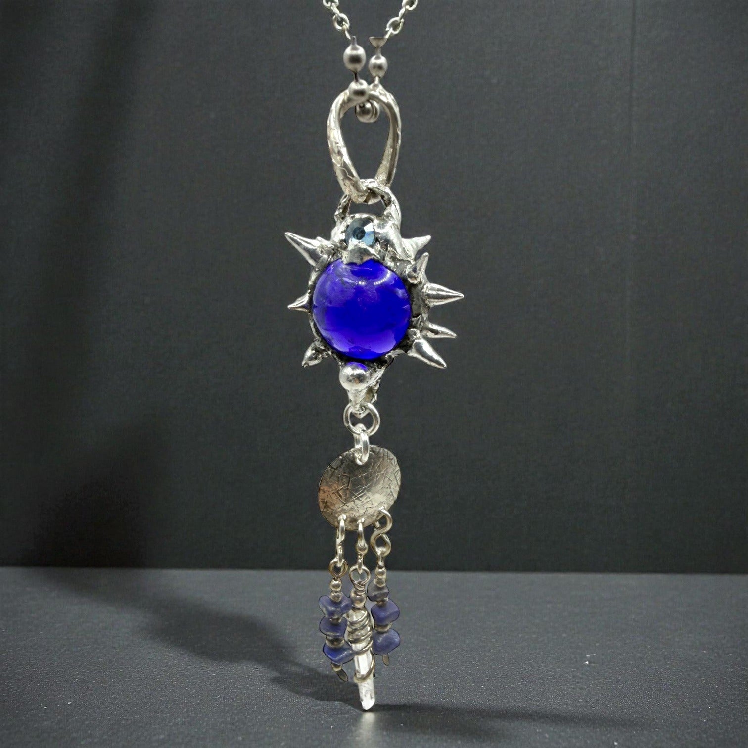 This pendant tells tales of elegance and mystery. A vintage cobalt glass marble takes center stage, surrounded by quartz, lapis lazuli, and crystal accents. The artisan’s touch breathes life into this one-of-a-kind creation, blending timeless beauty with intricate craftsmanship. A treasure for those drawn to unique narratives in jewelry.