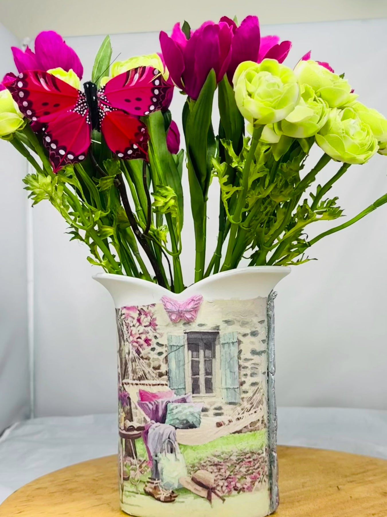 - Materials: Italian ceramic vase, decoupage napkins, hand-molded clay butterflies, varnish seal